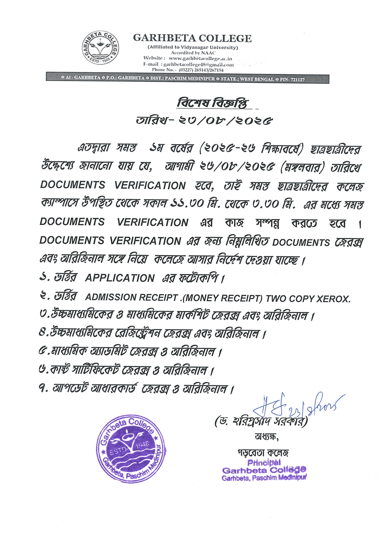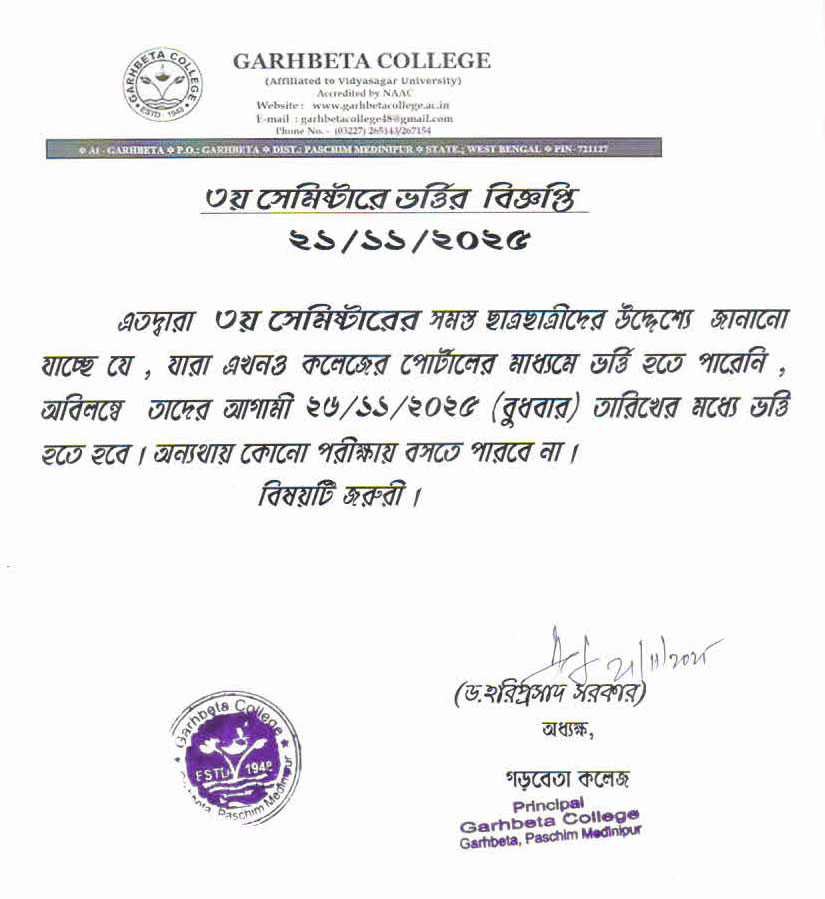 It is my immense pleasure to welcome all the students joining Garhbeta College for pursuing their higher studies during the session 2022-2023. Garhbeta College is one of the oldest colleges in the undivided Midnapore District in the post independence period. The college was established on 13th August, 1948 and we have celebrated the 75th years of establishment on 13th August, 2022 in a befitting manner. A three day programme has been organized on and from 13-15th August,2022 to celebrate the historic moment of our college. This academic session is very much important to all of us as it is treated as ‘75th Anniversary Year’ of Garhbeta College which will be completed by a similar colourful occasion on 13th August , 2023. A beautiful souvenir has been published to commemorate the great occasion. The college authority has decided to construct a ‘SMARAK BHAVAN’ ......