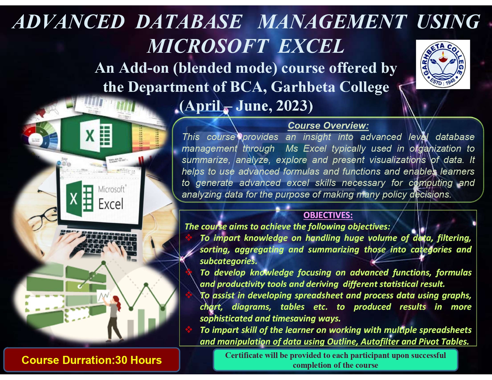 This course provides an insight into advanced level database management through Ms Excel typically used in organization to summarize, analyze, explore and present visualizations of data. It helps to use advanced formulas and functions and enables learners to generate advanced excel skills necessary for computing and analyzing data for the purpose of making many policy decisions.